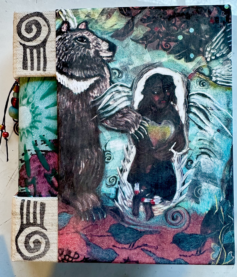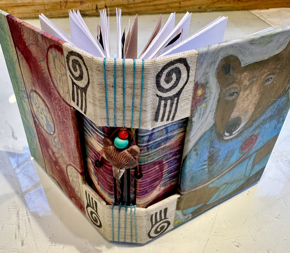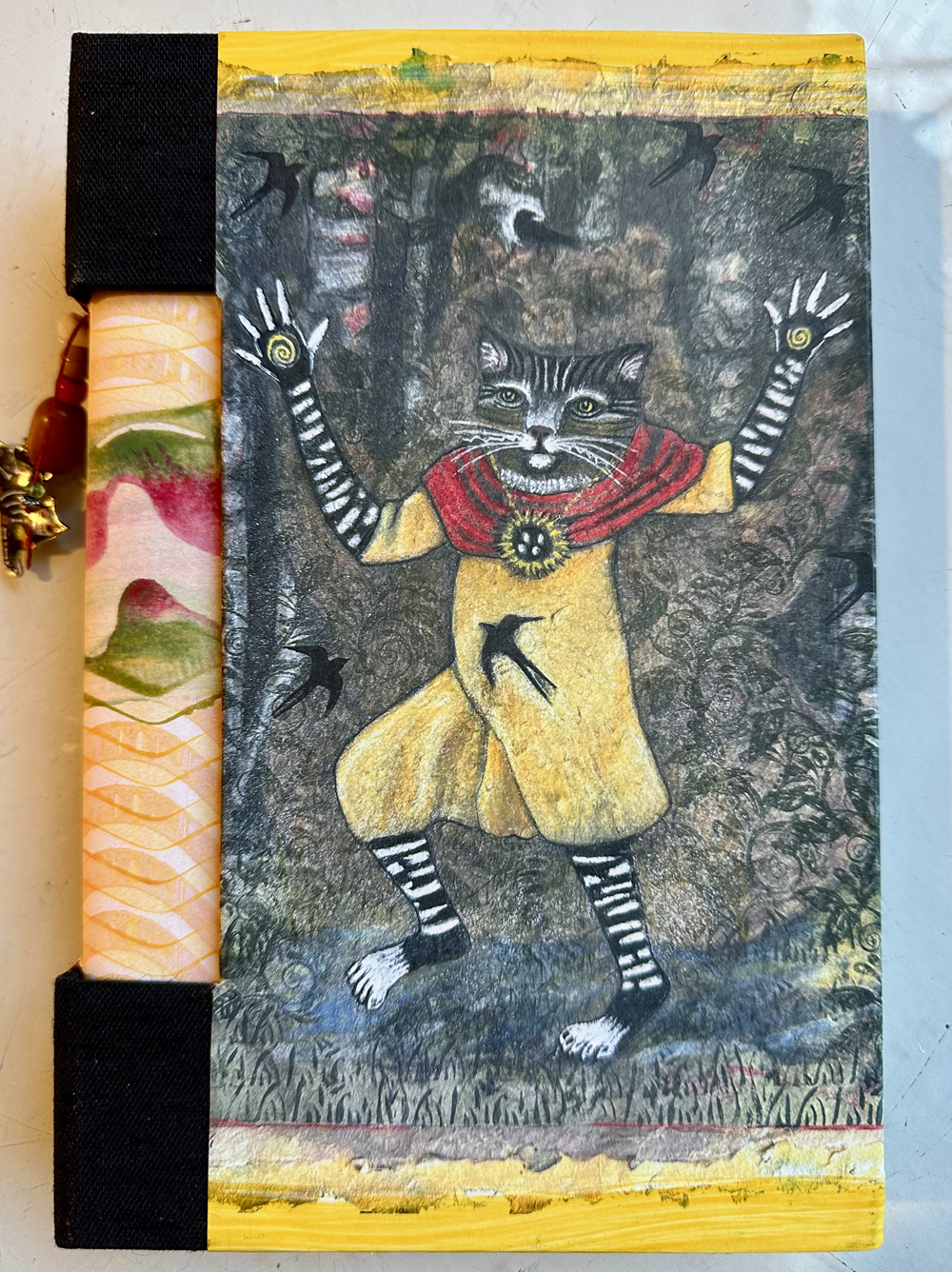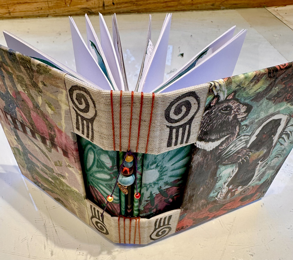 These journals are each one of a kind. They are made of acid free book board and archival glue. Some have original art work for the covers and some have giclee prints for the covers as well as paste paper that I have made. The pages are a smooth acid free drawing/writing paper. I make a variety of books, Mare’s Book (AKA,Button Hole) Japanese Stitch, Coptic, Jewel Back, and Chap books. With Mare’s Book I add beads to the spine. There are no two books alike.