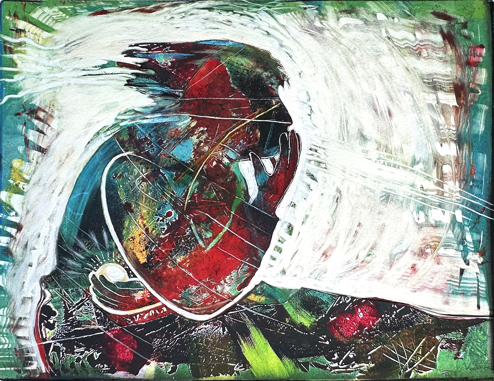 Monoprinting is my visual dialogue with the Dream; with my muse, with the unknown, with source, with what is in my heart to say and find. It is my life’s work. It is my Super Power. It is also a full- bodied meditative art excursion into the scary and wonder-filled unknown. It is a deep dive, all day and sometimes several days, decision fest of not knowing and trying very hard to follow an emerging visual story. My process is invigorating and honestly, it is exhausting.